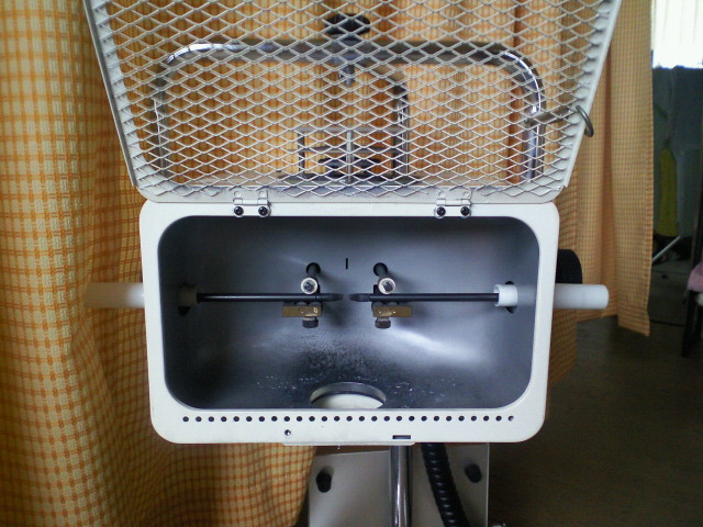 カーボンが中に2本入って、これが3000度で燃えます。太陽光の3倍の明るさで今入っているのが可視光線カーボンで、肌にいいですよ。燃えたカーボンはススとなって下に落ちています。